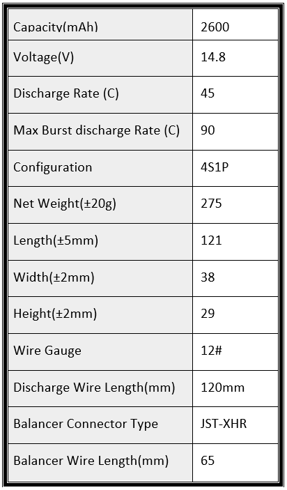 •Only use charger designed for lithium polymer/Lion battery. Do not use a NIMH/NICD/LIFEPO4/LEAD ACID charger.If the charger can support different battery types. Be absolutely sure to select the Lithium polymer(Lipo) mode on the charger. Failure to do so may cause a fire, which may result in personal injury and property damage.